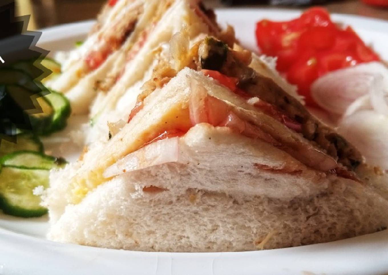 - Bread ko sides ko cut kar lain un pa mayo or ketchup laga lain kabab rakh da tomatoes rakh dain dosra slice rakh k egg rakh dain onion or cucumber rakh dain ab ek slice or rakh k halka sa press kar k cut kar lain