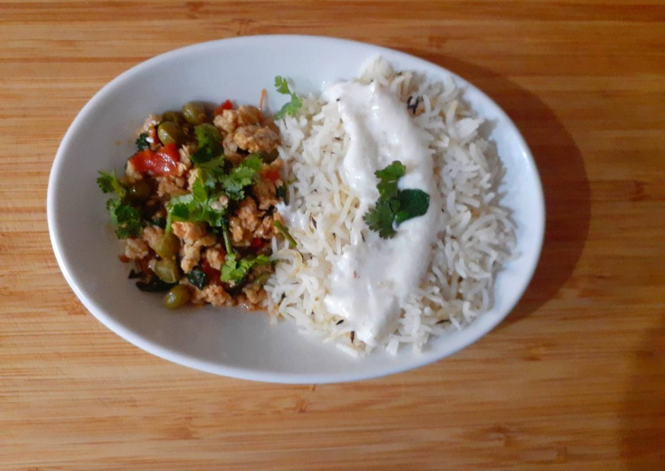 Cumin Inspired dish. A combination of delicious cumin rice with Chicken & mince curry served with yogurt spiced dip.