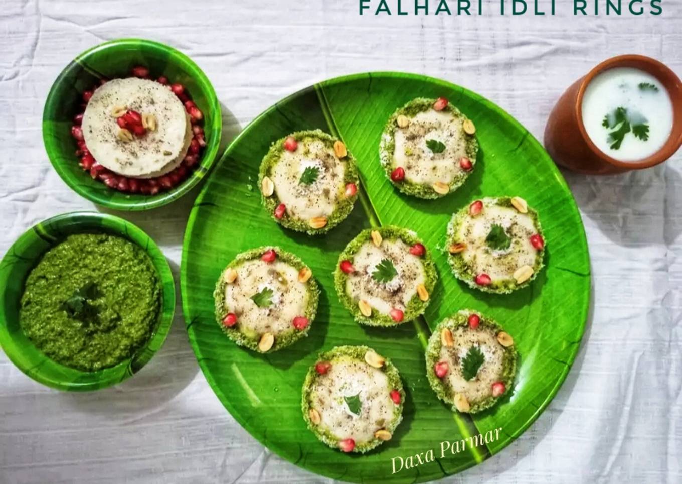 - Now garnish the idlis. Put coconut shreds and coriander leaves in the middle of the idli and put some pomegranate seeds and peanuts on top. Now our falhari idli is ready to eat. Serve this idli with coriander mint green chutney and buttermilk.