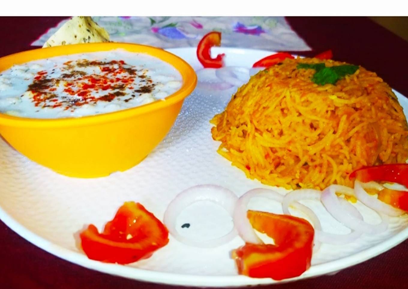 Tomato Rice with boondi Raita